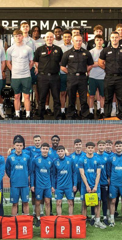 Firefighters from East Dunbartonshire recently shared CPR training and defibrillator guidance with Rangers and Celtic B Team players and coaches.